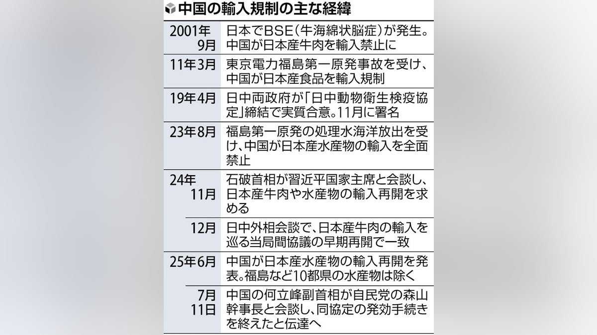 中国は、日本でBSEが01年9月に発生したことを受け、日本産牛肉の輸入を停止した。輸入再開に向け同協定は署名されたものの、中国側は発効手続きを5年半以上、たなざらしにし、輸入停止は約24年に及ぶ。