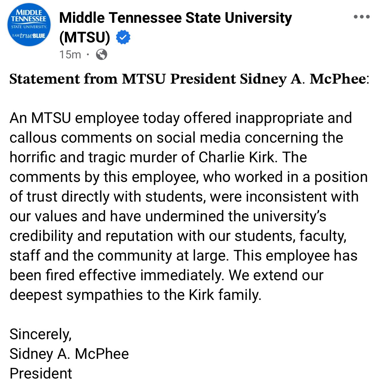 速報: MTSUの学生部長補佐が、チャーリーの死を祝う悪質なコメントを理由に即時解雇されました。