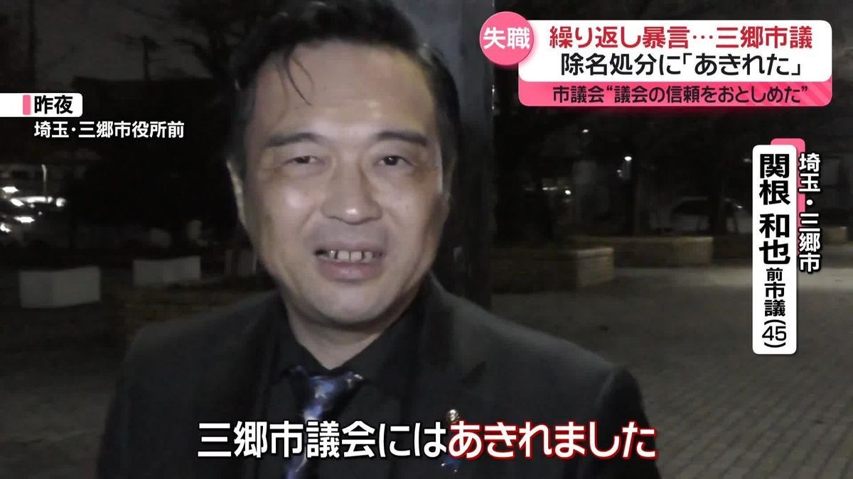 埼玉県三郷市の関根和也市議は3日夜、自らについて「(自分の)除名決議が出るようですが、除名は認めません。正義は勝たなければいけない」と語っていました。しかしこのあと、関根市議の除名処分が決まりました。
