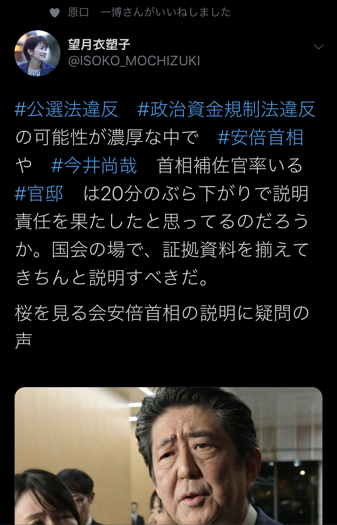 #公選法違反 #政治資金規制法違反 の可能性が濃厚な中で #安倍首相 や #今井尚哉 首相補佐官率いる #官邸 は20分のぶら下がりで説明責任を果たしたと思ってるのだろうか。国会の場で、証拠資料を揃えてきちんと説明すべきだ。- 3 名前:押しボタン式の匿名希望者 投稿日時:2019/11/17(日) 23:14:53.51 ID:f7VvlsMy0