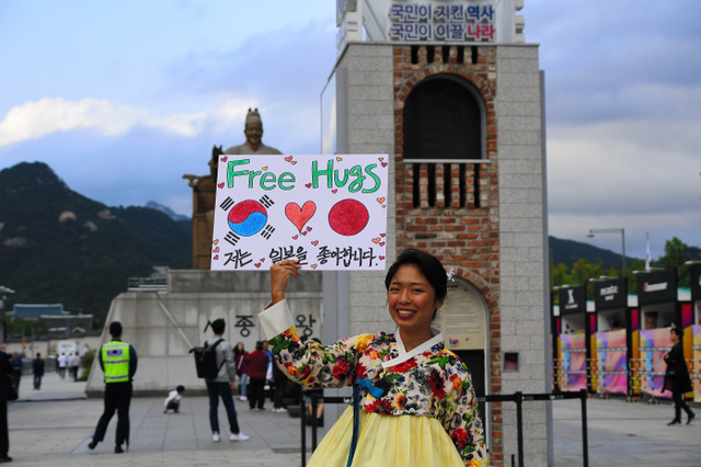 日韓の両政府がいがみ合うなか、相手の国を訪ねて、街角で見知らぬ人とフリーハグ(抱擁)を続ける男女がいる。