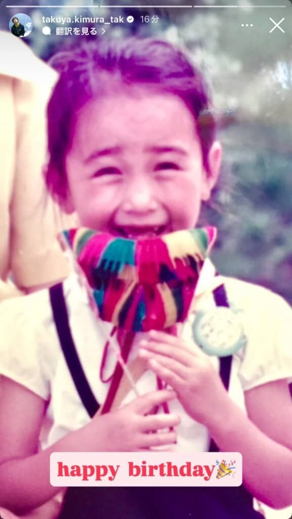 木村さんが「happy birthday」とクラッカーの絵文字を添えて投稿したのは、幼いころの工藤さんが写った写真。工藤さんはあどけない表情を浮かべ、目を細めています。