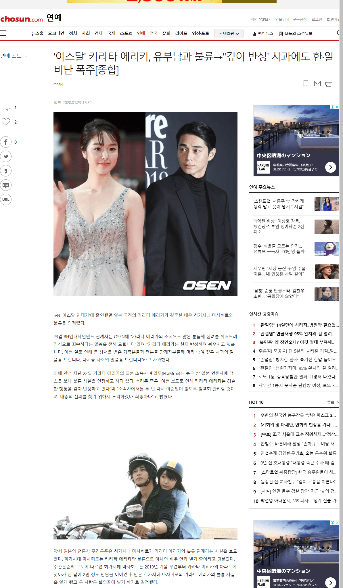 東出昌大と唐田えりかの不倫がお隣、韓国でも話題だ。報道もスポーツ紙やネット媒体だけでなく、全国紙の「朝鮮日報」なども報じている。