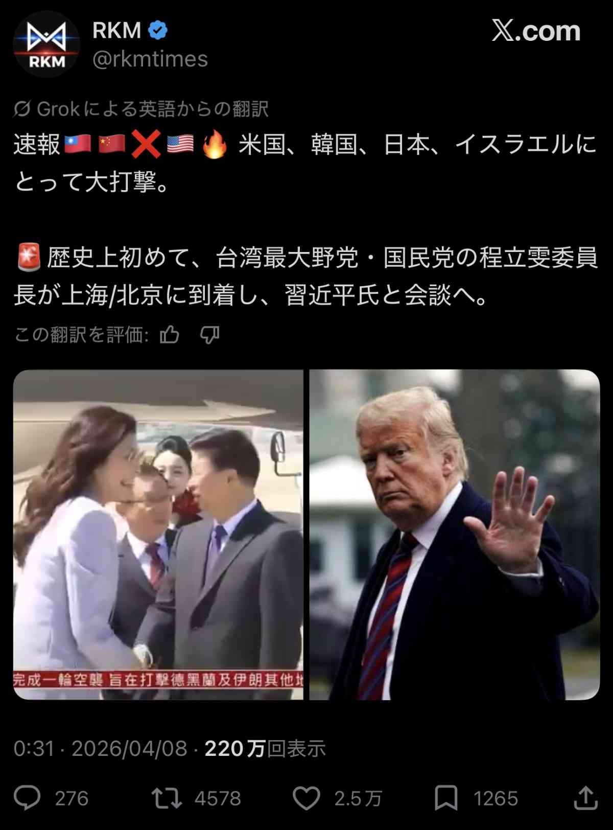 親中派の野党党首が習近平と会談するとか言ってたやつね
