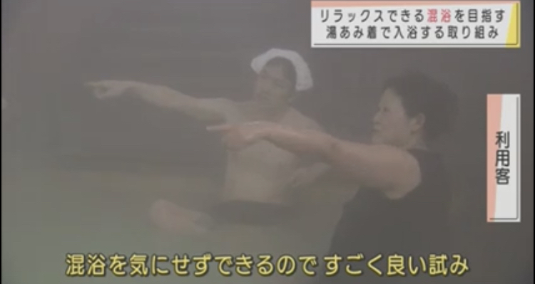誰もがリラックスできる混浴を目指します。青森市郊外の温泉で、湯あみ着を着て入浴する取り組みが行われました。