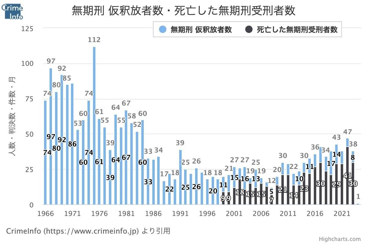 死刑に関する資料をまとめているNPO「CrimeInfo(クライムインフォ)」のサイトを参考に調べると、記録が残る1966年以降で、仮釈放された無期受刑者が「0?1人」という年は確認できない。