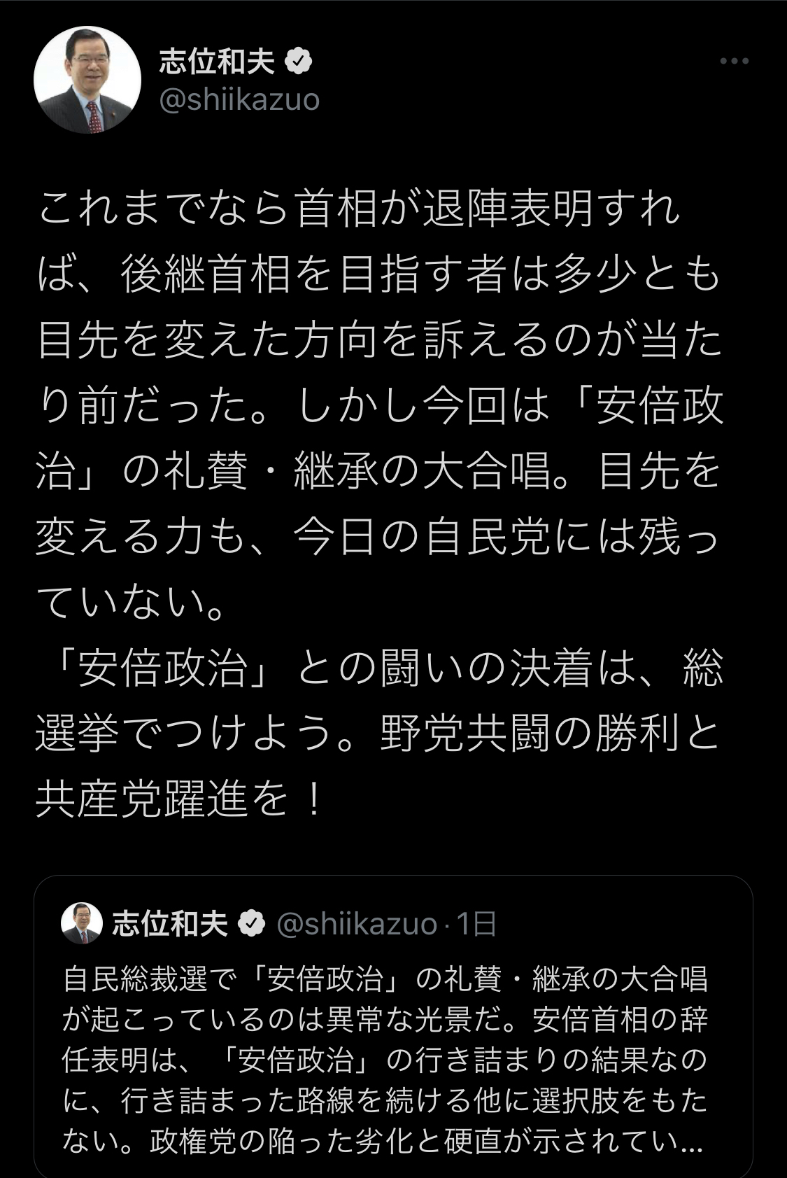 独裁歴20年の志位和夫共産党委員長さん「後継首相は多少とも目先を変えるのが当たり前だった」