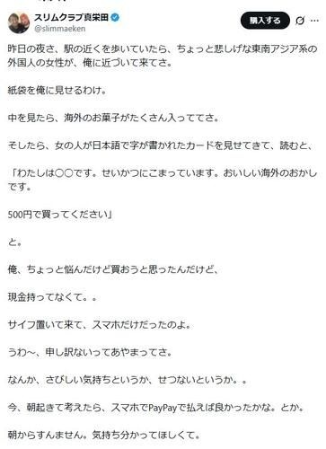真栄田は、前夜に駅付近を歩いていた際の出来事だとして「ちょっと悲しげな東南アジア系の外国人の女性が、俺に近づいて来てさ。紙袋を俺に見せるわけ。中を見たら、海外のお菓子がたくさん入っててさ」と書き出し、その女性から「わたしは◯◯です。せいかつにこまっています。おいしい海外のおかしです。500円で買ってください」と日本語で書かれたカードを示されたという。