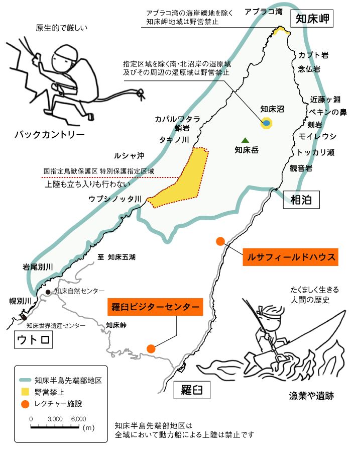 先端部地区はすべて知床国立公園に含まれています。羅臼側の海岸の一部を除く大部分が、もっとも厳格に保護される「特別保護地区」に指定されています。先端部地区は一般の観光客が利用するための道路や歩道等の施設が整備されていない原生的な場所です。この地の類い稀な自然を体験しようとする人は、全ての行動に自ら責任を持ち、自然の価値を次の世代にも引き継ぐためのルールの遵守が求められます。