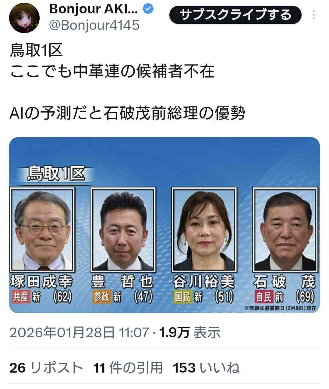 石破茂氏の鳥取1区。ここでも中革連の候補者が不在🤔