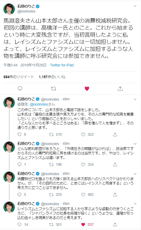 立憲石垣のりこ「山本太郎主催の減税研究会の講師はレイシストの高橋洋一なので、私は参加できません」