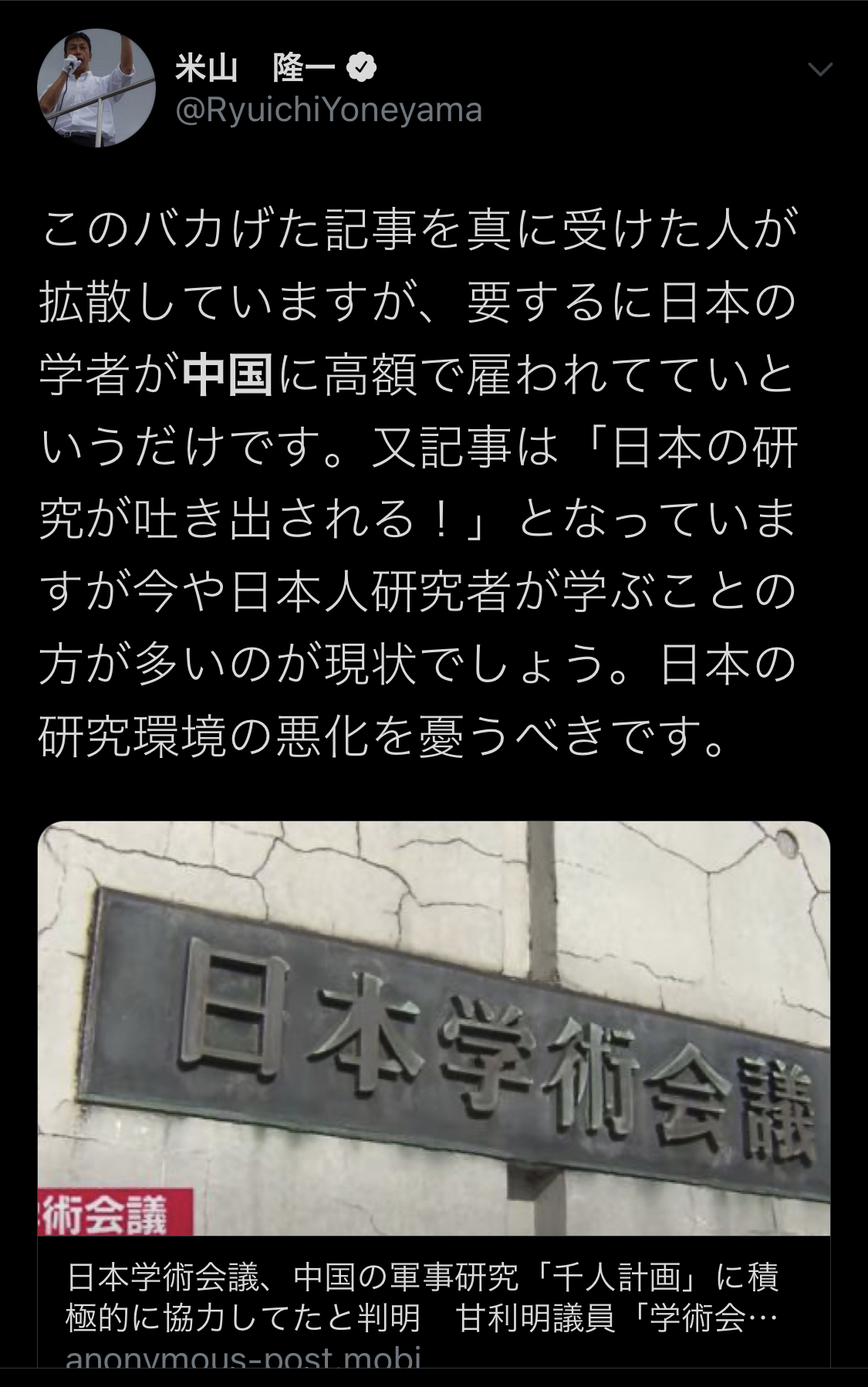 米山ハッピー「バカげた記事を真に受けて拡散しているが、日本の学者が中国に高額で雇われてていだけ」