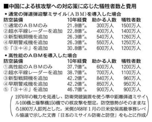 中国による核攻撃への対応策に応じた犠牲者数と費用詳細はソース
