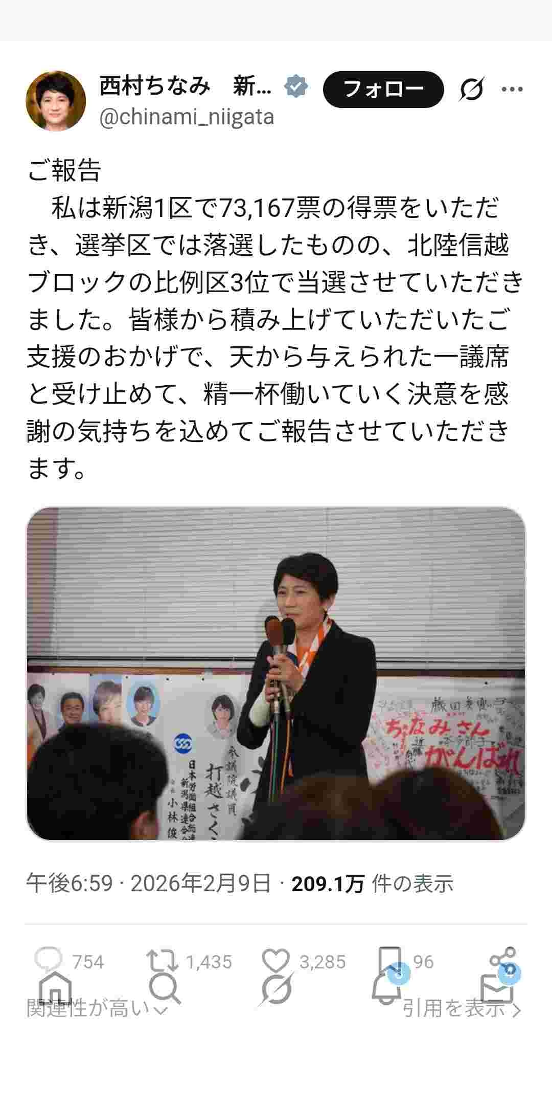 【高市解散】X荒れる「自民のおこぼれ議席だろ」惨敗中道の西村智奈美氏→自民余枠で異例の比例復活「天から与えられた1議席」と投稿 「天ではなく自民」「自民に貰った議席を忘れないで」厳しい声多数 昨秋予算委「奈良のシカ」追及で物議