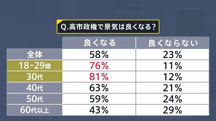 高市内閣で景気は良くなるかを聞いたところ、特に“働き盛り”の30代では81%が「良くなる」と回答している。
