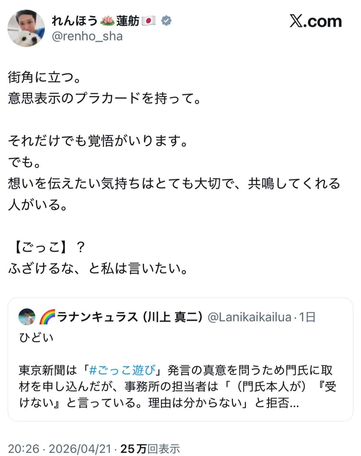 ふざけるな、と私は言いたい。 自民はこれまでもデモ軽視…門寛子衆院議員の「ごっこ遊び」発言に市民から批判の声 専門家の指摘は:東京新聞デジタル自民党の門寛子(かど・ひろこ)衆院議員(東京8区)がインターネット番組で、国会周辺での市民によるデモ活動を「ごっこ遊び」と揶揄(やゆ)...www.tokyo-np.co.jp
