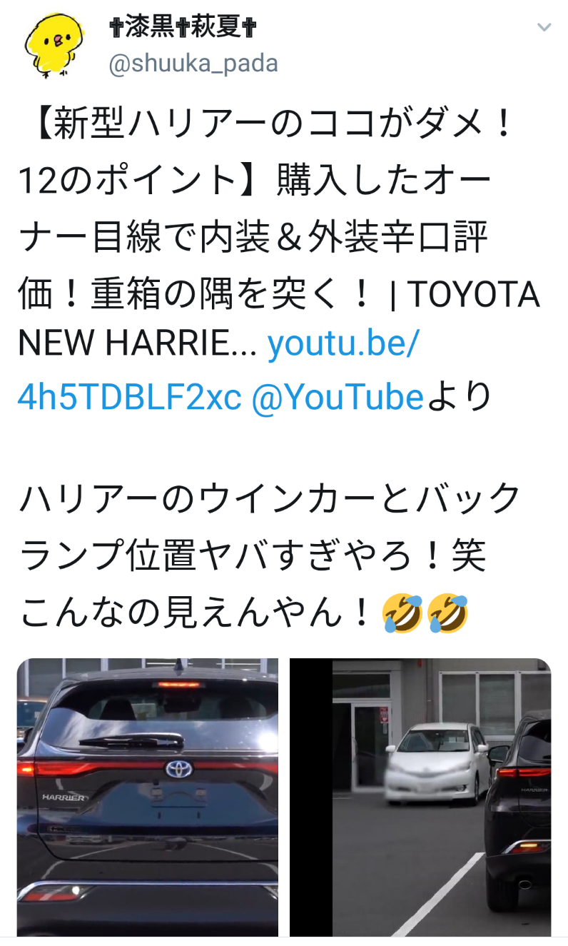 車カストヨタの新型ハリアーのウインカーとバックランプの位置が自転車歩行者殺しにかかってると話題に