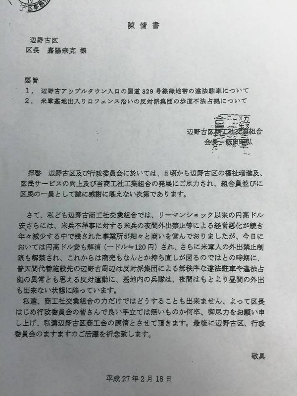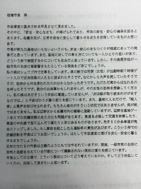 【名護】沖縄県名護市の米軍キャンプ・シュワブに隣接する久辺3区が、新基地建設に対する抗議活動に伴う違法駐車の取り締まり徹底やテントの撤去を関係機関に要請した件で、名護市は17日の市議会定例会で「表現の自由は憲法で保障されているが、近隣への迷惑まで許容されているとは考えない。要請に対し、県警などの対応を確認していきたい」との考えを示した。