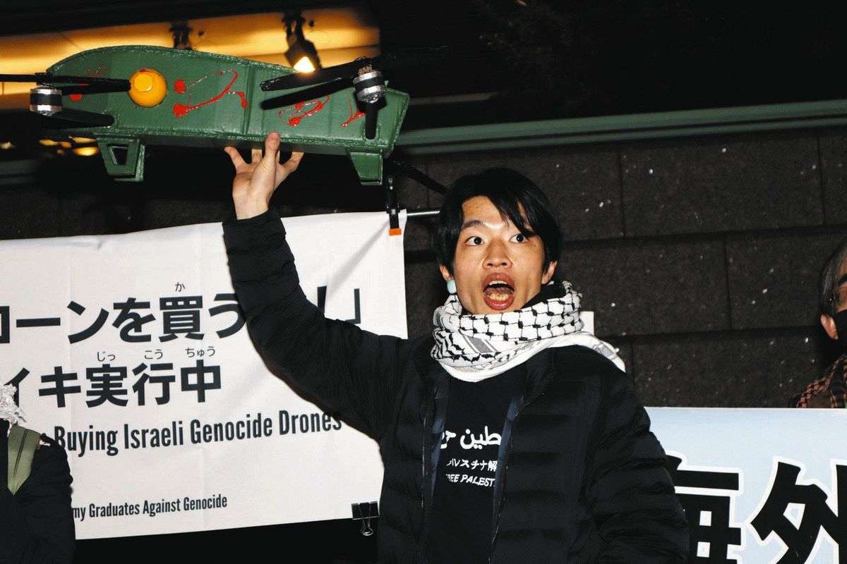 防衛省が導入する小型攻撃用ドローンの一般競争入札で、イスラエル製ドローンを選定しないよう求め、防衛大学校OBの平山貴盛さん(29)が26日夜、東京都新宿区の同省前でハンガーストライキを始めた。