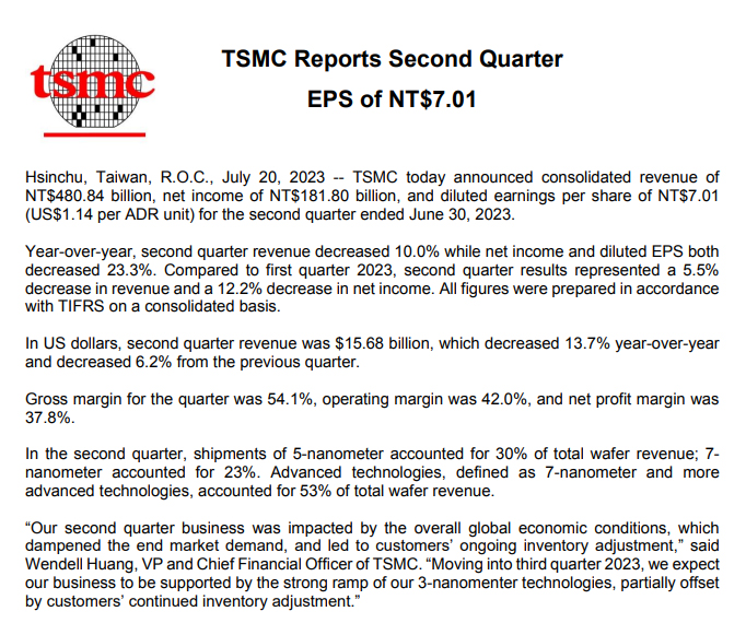 (後略)⇒参照・引用元:『TSMC』公式サイト「TSMC Reports Second QuarterEPS of NT$7.01」
