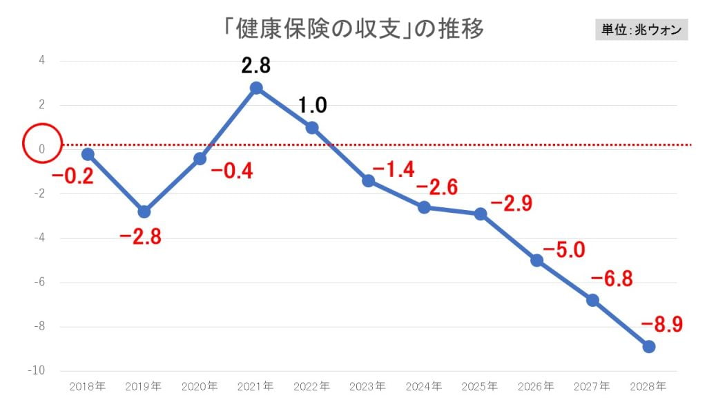 2028年:-8兆9,000億ウォン予測も含めて、「健康保険の収支」の推移をグラフにすると以下のようになります。