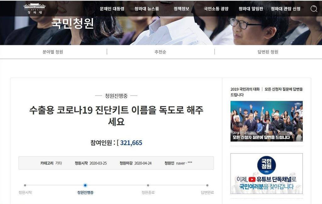 請願は25日に掲載され、「世界各国でわが国を新型コロナを克服した模範事例と認識」されているとした上で、感染者が急増する米国のトランプ大統領が韓国の文在寅(ムン・ジェイン)大統領に電話会談で診断キットなどの支援を要請したことを指摘。キットを「独島」という名称で輸出すれば、「地球を守る守護神として独島のステータスを大きく高めるのに役立つ」と主張している。