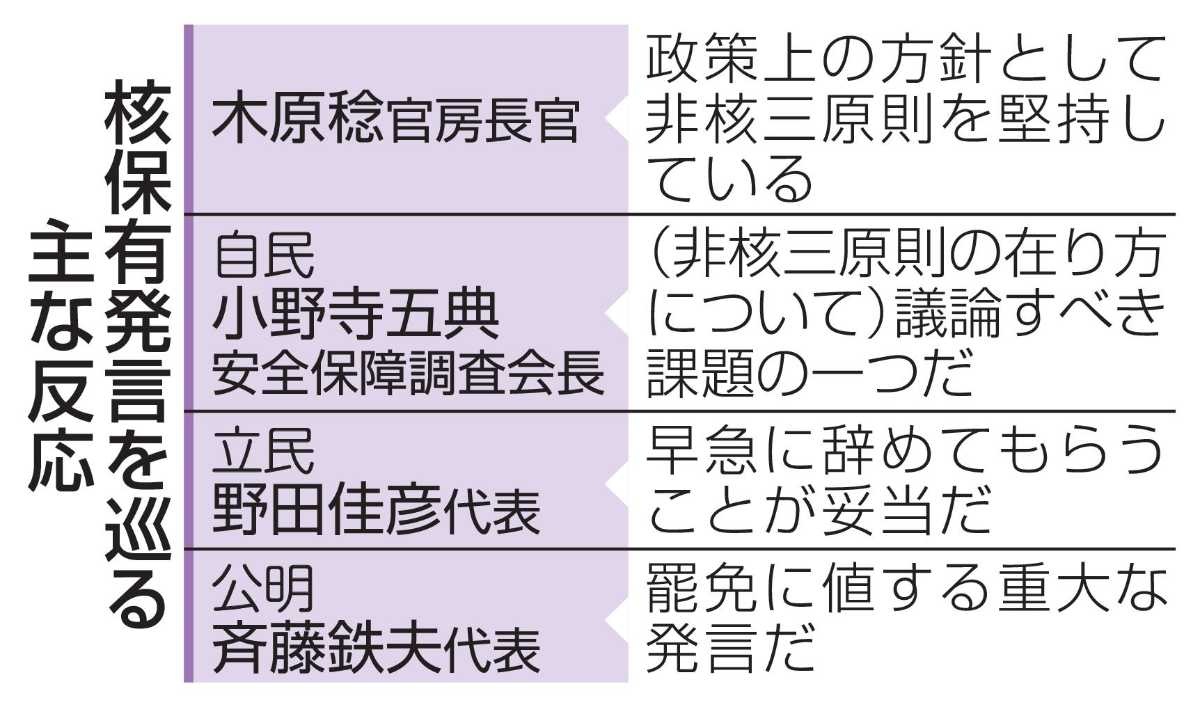 官邸筋は18日の非公式取材で記者団から核保有に対する考えを問われ答えた。「コンビニで買ってくるみたいにすぐにできる話ではない」とも言及した。関係者によると、発言が問題視されて以降も職務を継続し、23日には首相出席の関係閣僚会議にも参加していた。