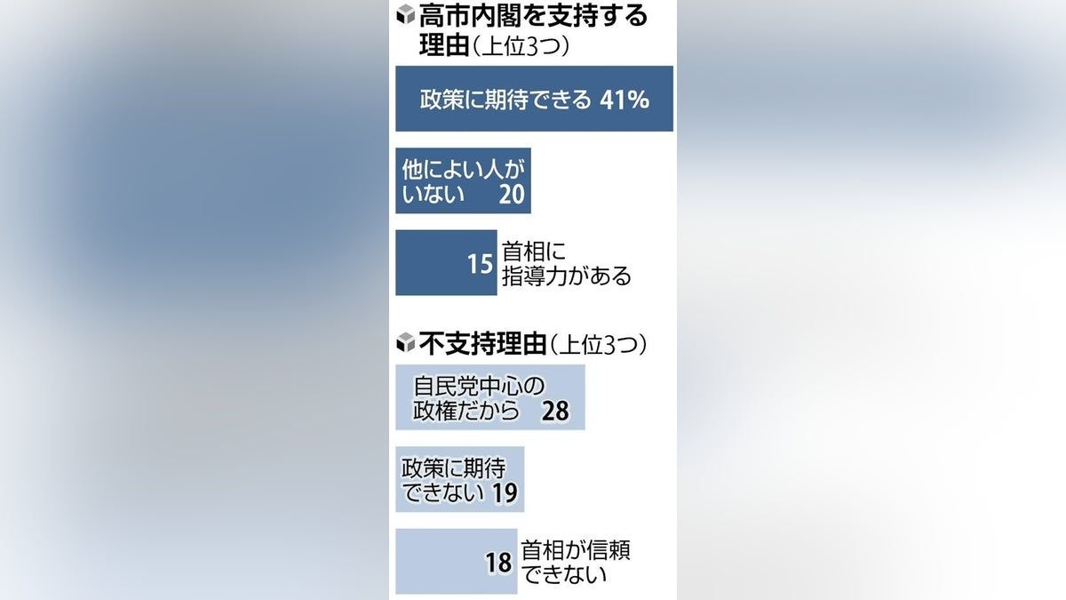 高市内閣を「支持する理由」を六つの項目から一つだけ選んでもらうと、「政策に期待できる」が41%でトップ、「他によい人がいない」20%、「首相に指導力がある」15%、「首相が信頼できる」12%、「閣僚の顔ぶれがよい」4%、「自民党中心の政権だから」5%の順だった。
