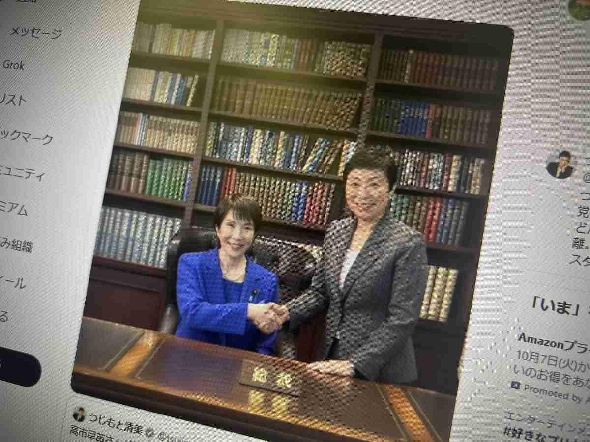 10月4日に投開票された自民党総裁選で新総裁に選出された高市早苗衆院議員と、立憲民主党の辻元清美衆院議員が総裁室で握手する、“ツーショット写真”が6日頃からXで拡散されている。米GoogleのAIモデル「Gemini」で生成されたものとみられ、辻元氏は「新聞社からも問い合わせが来た」と明かした上で、「もちろんフェイク」と否定した。