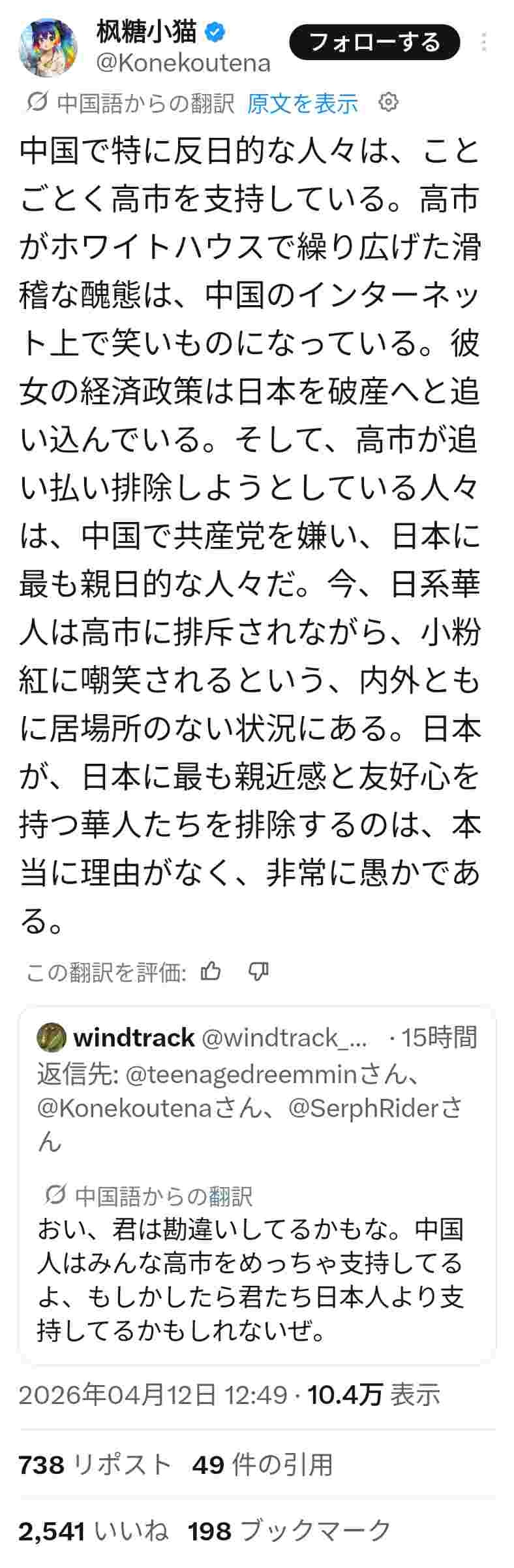高市叩きはキンペーの命令だぞ。キンペーに背いていいのか、中国人。