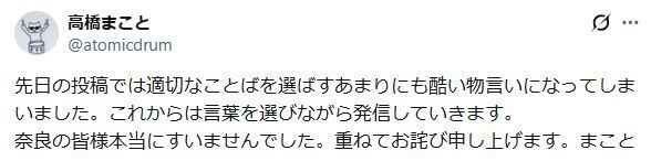高橋は「先日の投稿では適切なことばを選ばすあまりにも酷い物言いになってしまいました。これからは言葉を選びながら発信していきます」と謝罪。その上で「奈良の皆様本当にすいませんでした。重ねてお詫び申し上げます。まこと」とつづった。