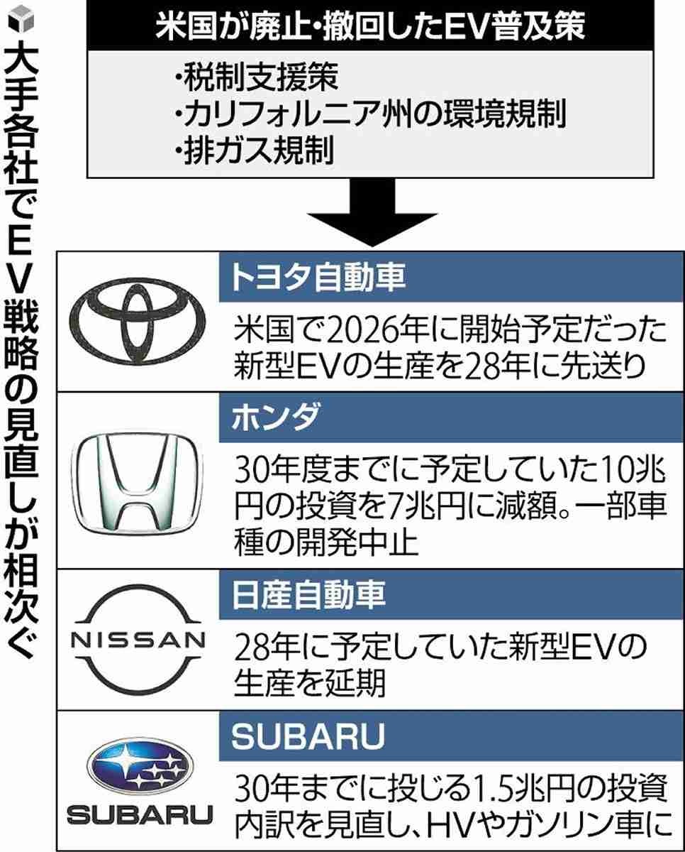 他社もEV戦略の修正を急いでおり、ホンダは計10兆円を計画していた関連投資を7兆円に減額。日産自動車は28年に予定していた新型EV生産を延期する。
