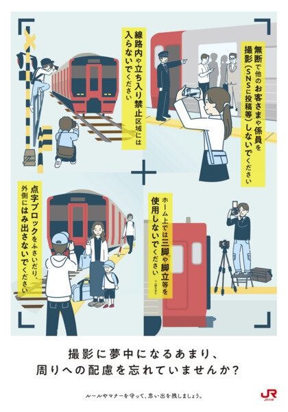 九州旅客鉄道(JR九州)は11月4日、同社施設内における撮影マナーについて、避けるべき行為を具体例を交えて公表した。撮影者による他の利用客への迷惑行為や、安全確保に支障を来すケースが発生したことを受けた対応だ。