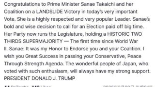 ニュー速+トランプ大統領「保守的な”力による平和” 政策が成功することを心から願っている」衆院選での自民圧勝に祝意 自身のSNSで