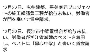 ニュー速中国浙江省高橋鎮賃金未払い、富力首凱賃金未払い、広州建設賃金未払い、中梁西月台賃金未払い…