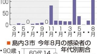 【淡路島】8月の島内感染者 257人 10代 46人、20代 47人、30代 49人、70代 3人、80代 1人、90歳以上 1人