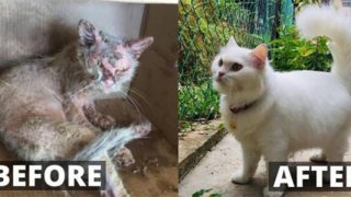 【社会】毛のほとんどを失いボロボロの状態だった野良猫が美しい白猫に成長するまでの物語