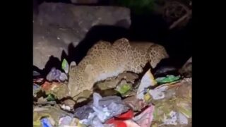 頂点捕食者であるインドのヒョウが、ゴミを漁って食べている