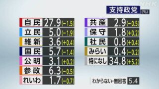 政党支持率 自民27.9% 参政6.3% 国民5.7% 立民5.0% | NHK