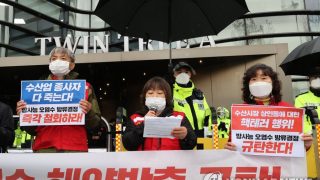 【韓国市民団体】雨の中で「海洋放出反対」警察官が傘を差しかけているように見える