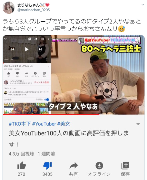 これを見ていた女性はTwitterで、「うちら3人グループでやってるのにタイプ2人やなぁとか無自覚でこういう事言うからおぢさんムリ」と投稿。それが切っ掛けで動画が炎上してしまい、TKO木下さんの動画は高評価が308、低評価が6485となっている。
