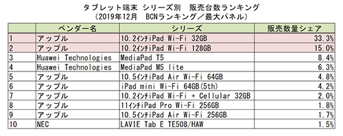 ファーウェイ、NECは前年を割ったが、レノボは133.2%と成長しており、1月以降は順位変動が起こる可能性もある。シリーズ別では前月に続き、「iPad 10.2インチ 第7世代 Wi-Fiモデル」が首位をキープ。