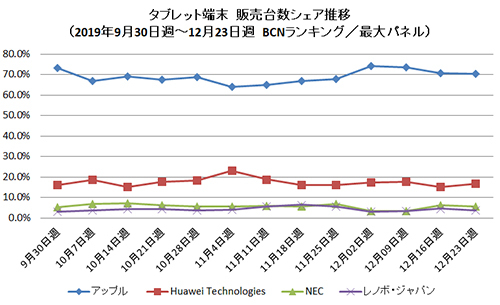 年末商戦に加えて、1月14日のWindows 7サポート終了に伴うPCの買い替えの候補としてタブレットが選ばれたことも影響しているようだ。12月週次のメーカーシェア推移では、アップルが4週連続で70%超えを達成。